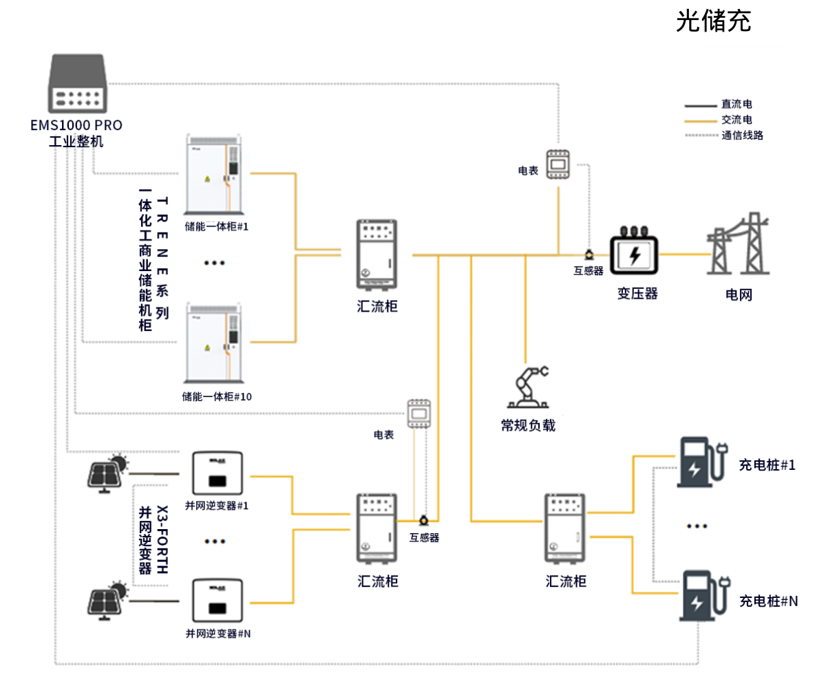X3-FORTH可与储能系统结合,构建光储+解决方案,涵盖了并网应用、并离网应用、光储柴微网应用、光储充应用等场景,展现了其在不同需求下的强大适应性与应用前景。